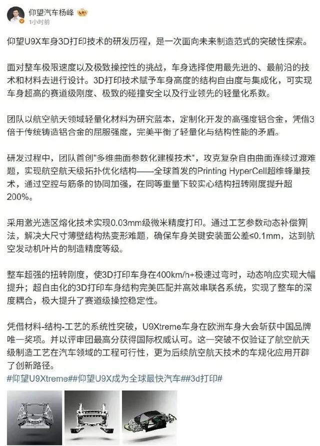 其实,在追求车身轻量化,降低能耗与异响风险,提升车身刚性和空间利用率,为电池扩容预留空间方面,所有车企都是一样的,都在不断地寻求突破,大压铸只是其一,比亚迪在仰望U9X 上就使用了3D打印技术减重提升性能,其实也是高端制造的一个方向。