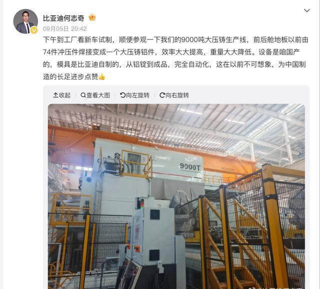 今年9月份,比亚迪何志奇就在社交媒体上公布了9000吨大压铸生产线。他表示“前后舱地板以前由74件冲压件焊接变成一个大压铸铝件,效率大大提高,重量大大降低。”
